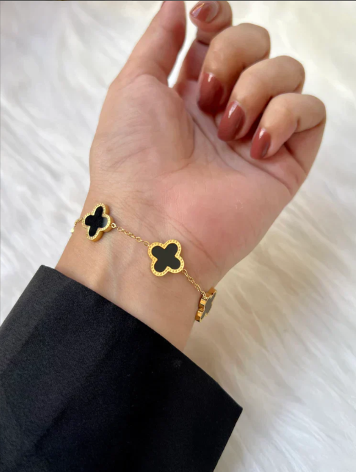 Clover Bracelet. Featuring a sleek design adorned with a four-leaf clover motif in black, this bracelet exudes charm and sophistication. Perfect for adding a touch of elegance to any outfit, it's an ideal accessory for those who appreciate symbolic and fashionable jewelry.